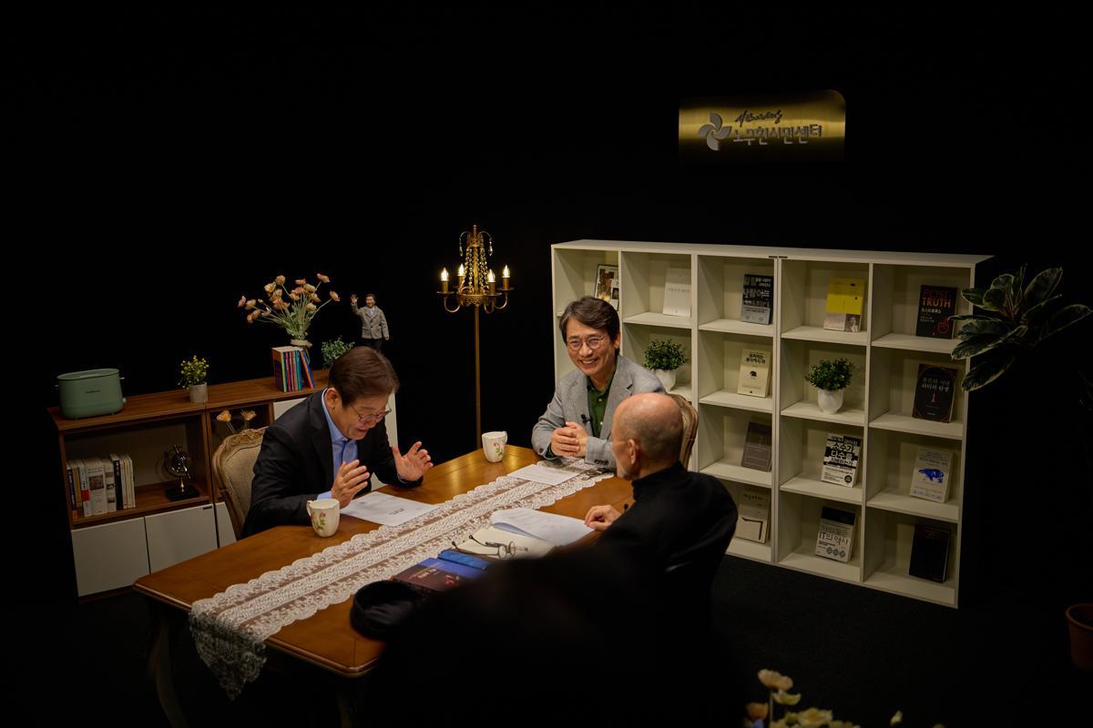 대선 출마를 선언한 이재명 더불어민주당 전 대표가 유시민 작가, 도올 김용옥 선생과 새 정부의 과제 등을 주제로 대담한 사진이 15일 공개되고 있다. (이재명 캠프 제공) 2025.04.15 |