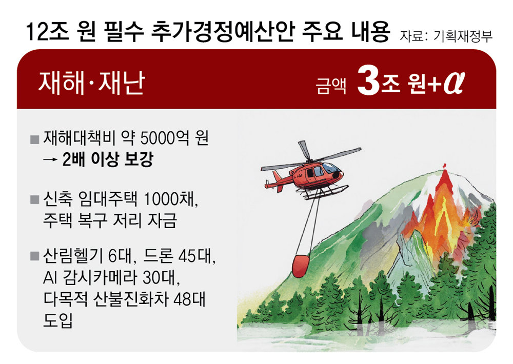 정부는 15일 필수 추경을 통해 우선적으로 재해·재난 대응에 3조 원 이상을 편성할 계획이라고 밝혔다. 신속한 산불 피해 복구를 위해 재해대책비가 기존 5000억 원에서 1조 원 이상으로 증액됐고 산림헬기를 비롯한 첨단장비 도입, 재해 예비비 등에도 2조 원 이상이 책정됐다.