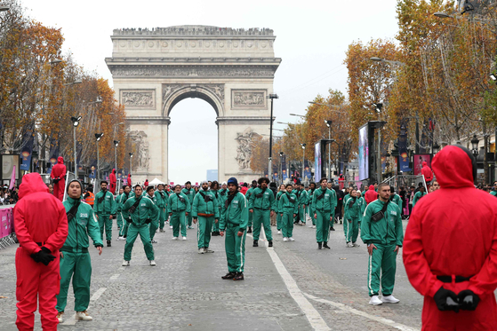 프랑스 파리 샹젤리제 거리에서 참가자들이 ‘오징어 게임’에 등장하는 무궁화 꽃이 피었습니다 게임에 참여하는 모습. AFP=연합뉴스 |