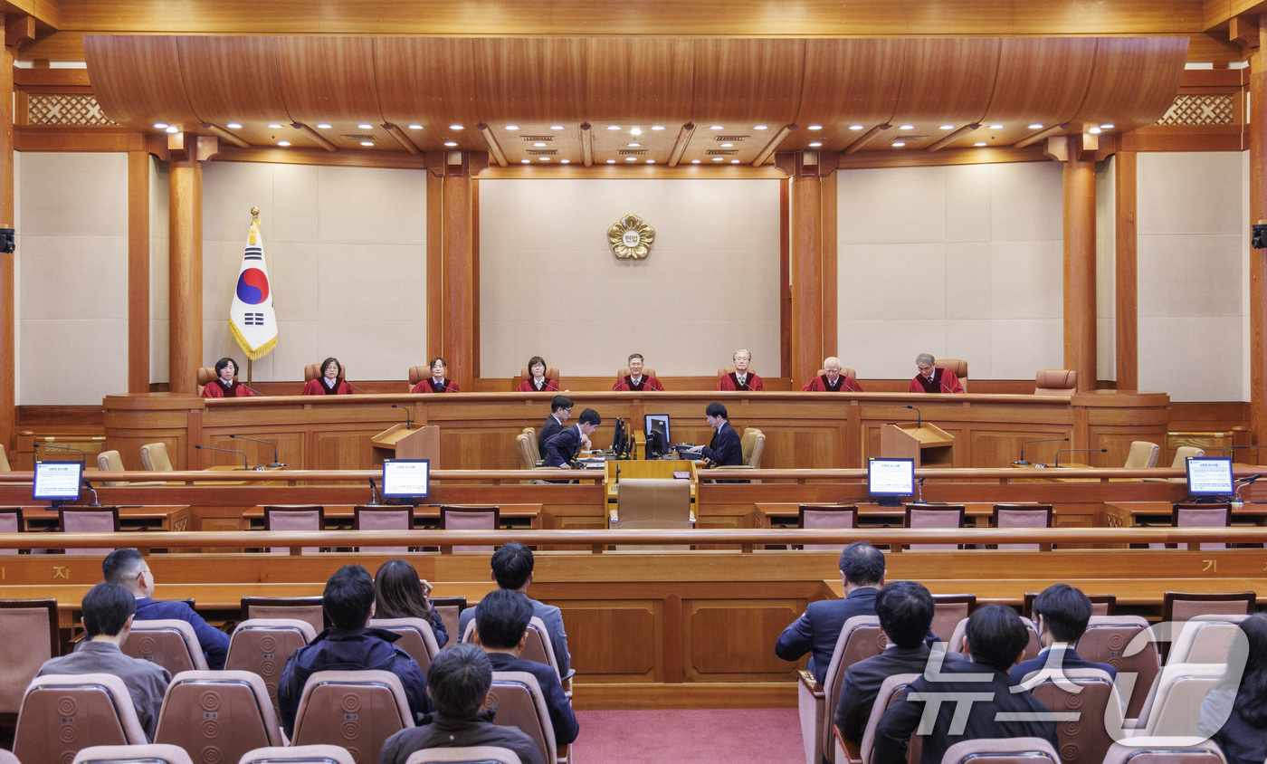 문형배 헌법재판소장 권한대행을 비롯한 헌법재판관들이 10일 오후 서울 종로구 재동 헌법재판소에서 열린 박성재 법무부장관 탄핵 심판 선고를 위해 대심판정에 착석하고 있다. (공동취재) 2025.4.10/뉴스1 ⓒ News1 오대일 기자 |