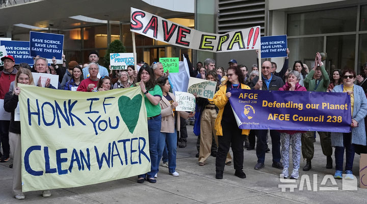 [필라델피아=AP/뉴시스] 3월 25일 미 펜실베이니아주 필라델피아에서 환경보호청(EPA) 직원들과 그 지지자들이 도널드 트럼프 행정부의 EPA 예산·인원 감축 조치에 반대하며 행진하고 있다. 트럼프는 바이든시대이 공해 규제를 뒤엎고 행정명령을 통해 최근 에너지 대기업들의 석탄사용 공장과 발전소들에 대한 공해 규제를 면제했다. 2025.04. 16. |