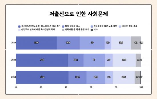 조사 결과 저출산에 따른 사회적 우려는 '세금 증가'가 32.5%로 가장 높았다. '연금 고갈'과 '복지혜택 축소'를 우려하는 응답도 각각 20.0%, 18.3%로 뒤를 이었다. 특히 연금 고갈 우려는 2018년 14.9%, 2022년 17.0%에서 2024년 20.0%로 상승했다. 복지혜택 축소 역시 같은 기간 12.4%에서 18.3%로 늘었다.