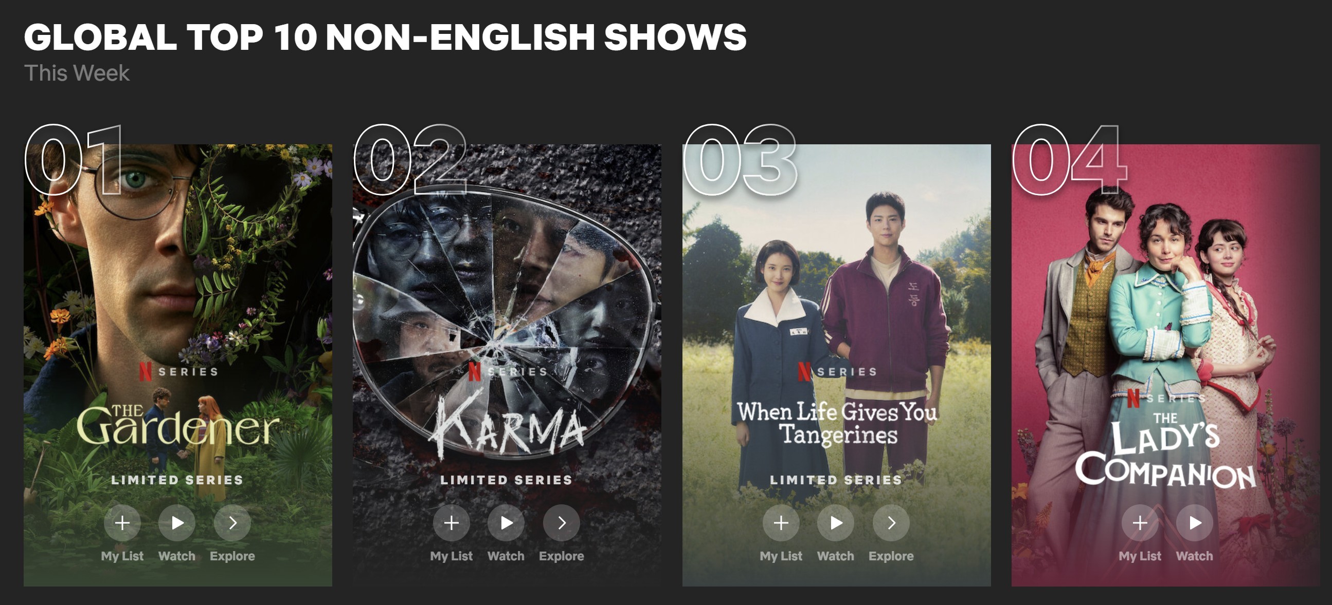 '넷플릭스 톱 10' 최신 집계(16일 자)에 따르면, 총 6편의 한국 작품들이 글로벌 톱 10 시리즈(비영어) 부문 톱 10 순위에 이름을 올렸다.