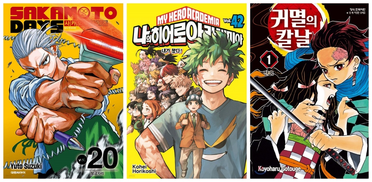 OTT 공개 후 인기 만화 '사카모토 데이즈', '나의 히어로 아카데미아', '귀멸의 칼날'(왼쪽부터). |