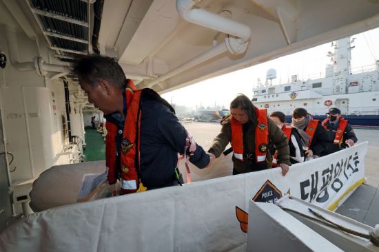 16일 오전 전남 목포시 목포해경부두에서 세월호 희생자 가족들과 4·16 재단 관계자 등이 세월호 선상추모식을 위해 경비함정에 탑승하고 있다. 연합뉴스 |