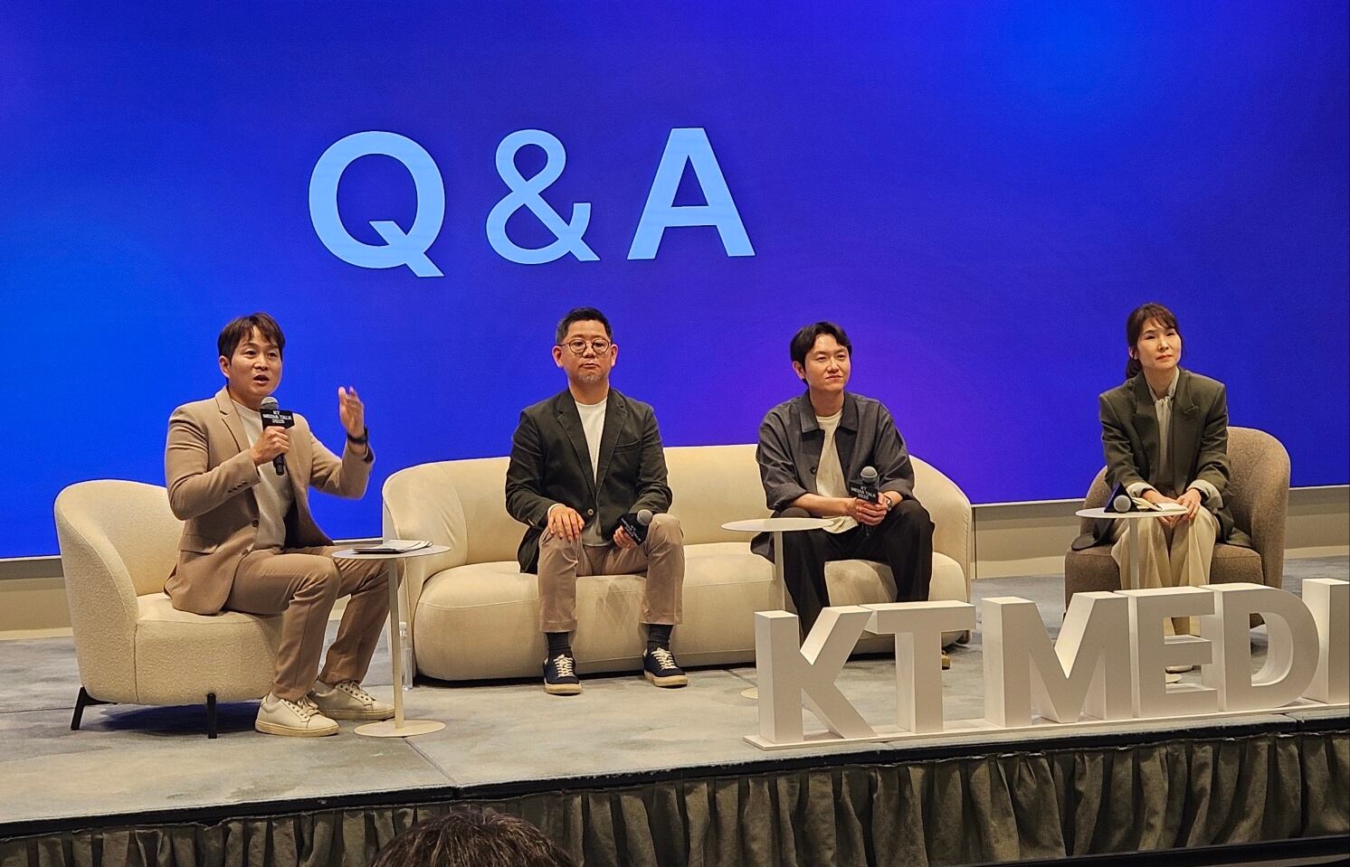 KT가 16일 서울 강남구 안다즈 서울 강남 호텔에서 기자간담회 ‘KT그룹 미디어토크’를 열었다. 김채희(오른쪽) KT 미디어부문장(전무), 신종수(오른쪽에서 두 번째) KT 미디어전략본부장(상무), 정근욱(왼쪽에서 두 번째) KT스튜디오지니 대표가 질문에 답변하고 있다./윤예원 기자 |