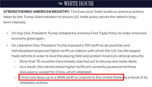 이어 백악관은 "중국은 보복 행동의 결과, 이제 최대 245%의 미국 수입품(중국의 대미 수출품) 관세에 직면했다"고 했다.
