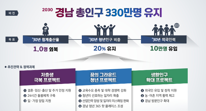 도는 2030년까지 총인구 330만 명 유지, 합계출산율 1명 회복, 청년인구 비중 20% 유지, 외국인력 10만 명 유입 등을 목표로 삼았다. 이를 위해 12조 원을 들여 저출생 극복, 청년인구 유출 대응, 생활인구 확대 등 3대 분야 10대 프로젝트를 추진한다.