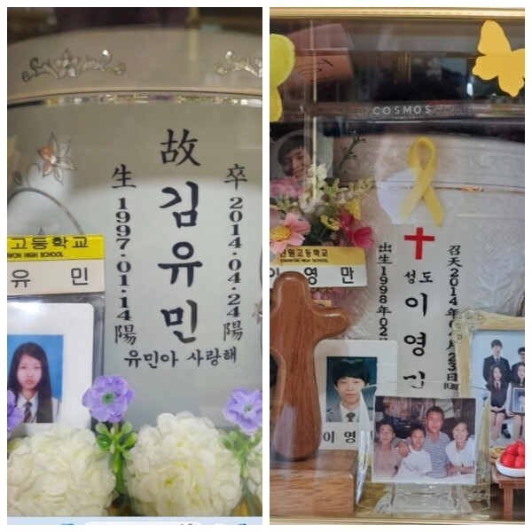 추모관에 있는 고 김유민, 이영만 학생. 최근 가족들이 추모관에 다녀왔다. 유민 아빠, 영만 엄마 페이스북 갈무리 |