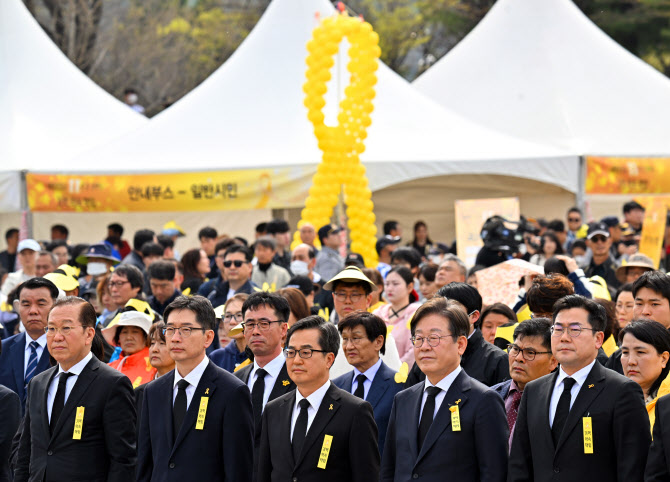 세월호 참사 11주기를 맞은 16일 안산시 단원구 화랑유원지에서 열린 ‘세월호 참사 11주기 기억식’에서 더불어민주당 박찬대 당 대표 권한대행 겸 원내대표(오른쪽부터), 이재명 전 대표, 김동연 경기지사, 김경수 전 경남지사, 국민의힘 권영세 비상대책위원장이 참석해 있다. (사진=연합뉴스) |