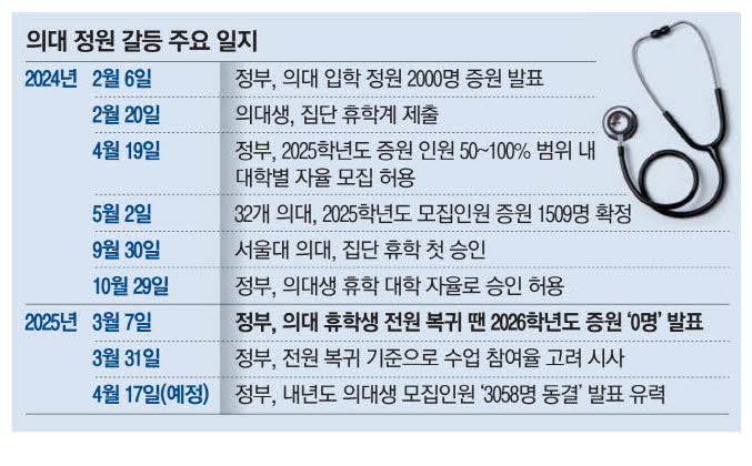 이주호 사회부총리 겸 교육부 장관은 지난달 7일 브리핑에서 "3월 말 학생들의 전원 복귀를 전제로 2026학년도 모집인원에 대해 의총협 건의에 따른 총장님들의 자율적 의사를 존중하고자 한다"며 "3월 말까지 의대생이 복귀하지 않을 경우 2026학년도 모집인원을 2024학년도 정원 수준으로 조정하는 방안은 철회되고, 입학 정원은 당연히 5058명으로 유지될 것"이라고 못 박은 바 있다.