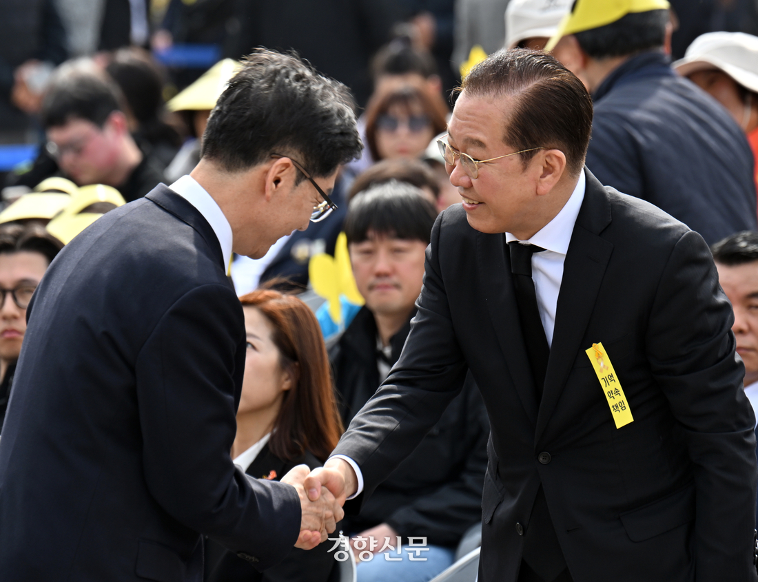 세월호 참사 11주기를 맞은 16일 오후 안산시 단원구 화랑유원지에서 열린 ‘세월호참사 11주기 기억식’에서 김경수 예비후보와 권영세 국민의힘 비대위원장이 인사를 나누고 있다. 권도현 기자 |
