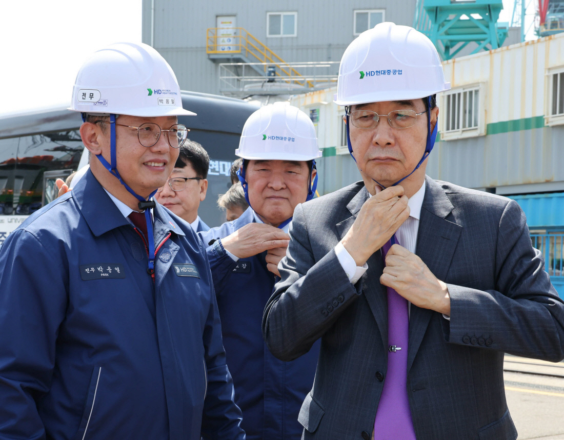 울산행 한덕수 “트럼프와 통화서 한·미 조선 협력 강화하기로” 한덕수 대통령 권한대행 겸 국무총리가 16일 울산 HD현대중공업을 방문해 권오갑 회장(가운데) 등 임직원들과 현장을 시찰하고 있다. 울산 | 김창길 기자 cut@kyunghyang.com |