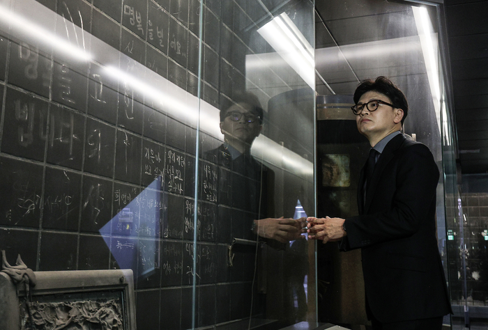 대선 경선주자인 한동훈 전 국민의힘 대표가 16일 오후 대구지하철 중앙로역을 찾아 대구지하철 화재 참사 기억공간을 살펴보고 있다. [사진출처=뉴스1] |
