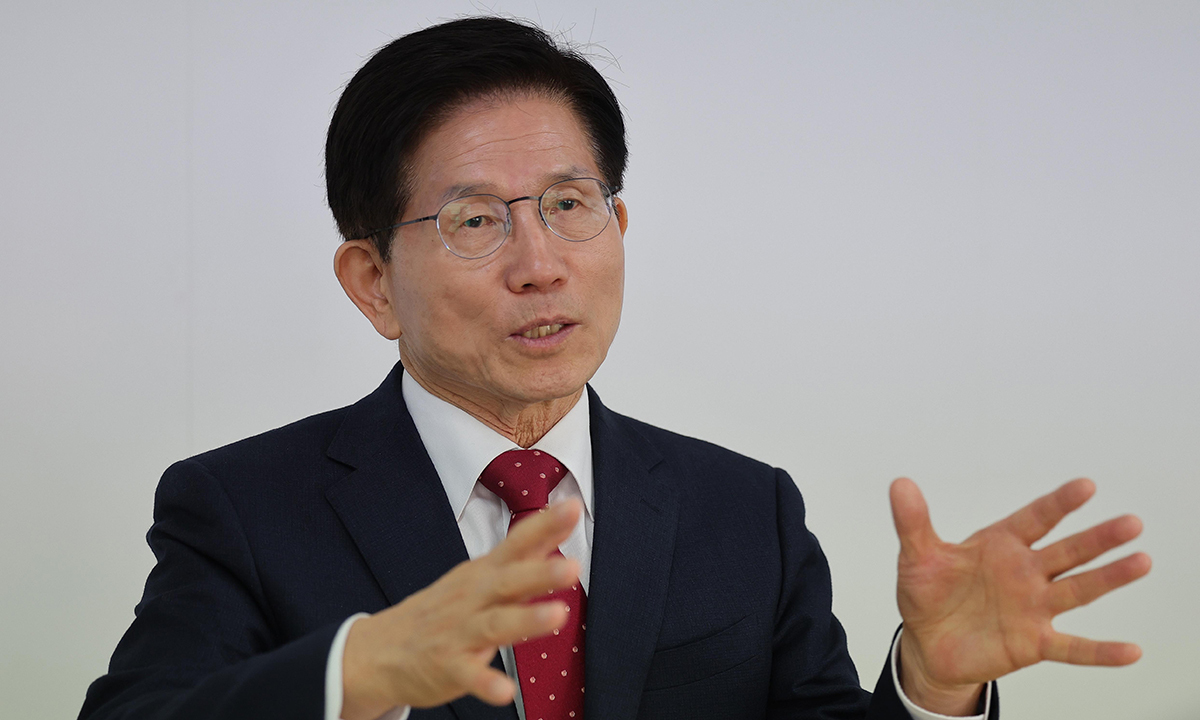 국민의힘 김문수 대선 경선 후보가 16일 서울 여의도 캠프 사무실에서 진행한 세계일보와의 인터뷰에서 우리 사회의 시대적 의제에 대해 설명하고 있다. 이재문 기자 |