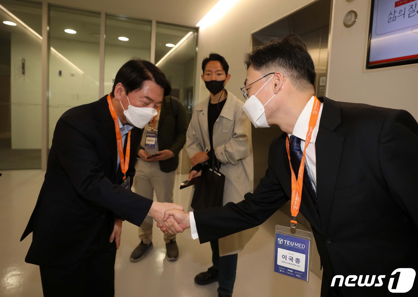 2022년 4월 30일 안철수 대통령직인수위원장과 이국종 아주대 교수가 서울 중구 DDP(동대문디자인플라자)에서 동그라미재단이 주최한 TEU-MED 2기 오리엔테이션에 참석해 인사를 하고 있다. (공동취재) 2022.4.30/뉴스1 ⓒ News1 오대일 기자 |