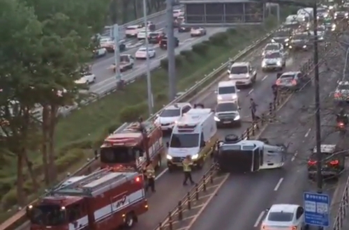 (서울=연합뉴스) 최원정 기자 = 17일 오전 5시 50분께 서울 영등포구 신길동 노들로에서 30대 여성이 몰던 SUV가 맞은편에서 달리던 승용차 1대와 부딪친 뒤 옆으로 넘어졌다.