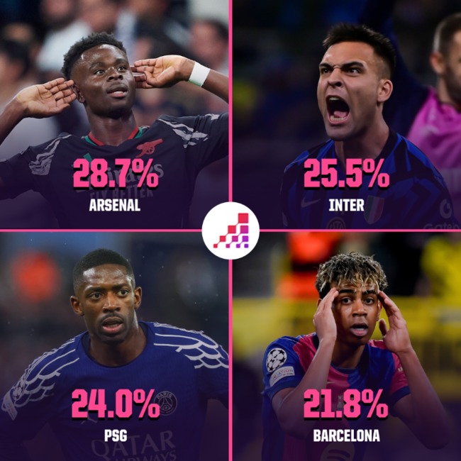 '옵타'는 우승 가능성이 가장 높은 팀으로 아스널을 선정했다. 매체는 "아스널은 UCL에서 우승할 것으로 예상되는 팀(28.7%)이다"라며 "PSG는 24%로 인터 밀란(25.5%)에 이어 세 번째로 높다. 바르셀로나는 21.8%로 UCL에서 우승할 것으로 예상된다"라고 전했다.