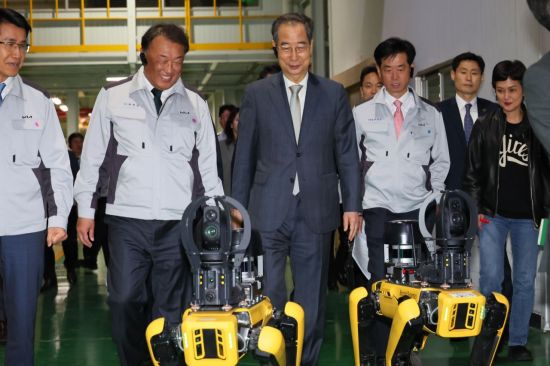한덕수 대통령 권한대행 국무총리가 15일 기아 오토랜드 광주공장에서 로봇개 '스팟'을 보고 있다. 연합뉴스 |