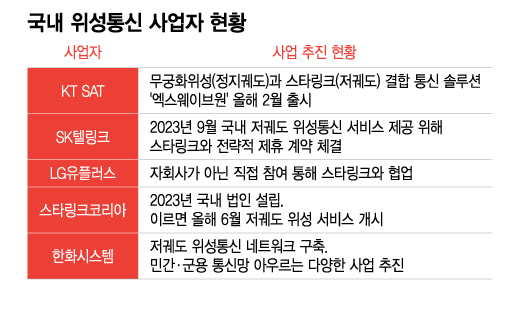 SK텔레콤 자회사 중 SK텔링크도 2023년 9월 국내 저궤도 위성통신 서비스 제공을 위해 스타링크와 전략적 제휴 계약을 체결했다. LG유플러스는 자회사가 아닌 직접 참여를 통해 스타링크와 협업했다. 이밖에 스타링크코리아가 2023년 국내 법인 설립 후 이르면 6월 저궤도 위성통신 서비스를 개시한다. 한화시스템은 저궤도 위성통신 네트워크 구축으로 민간과 군용 통신망을 아우르는 다양한 사업을 추진한다. 지난해 10월에는 국내 기업 최초로 저궤도 위성용 ISL(위성 간 레이저 통신) 장비 개발을 완료했다.