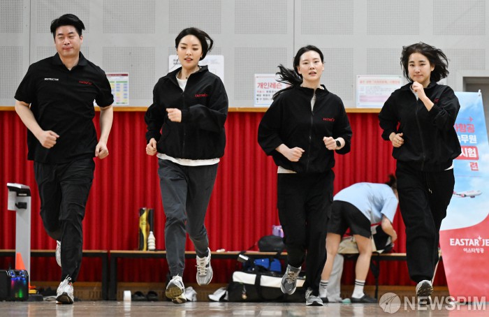 [서울=뉴스핌] 최지환 기자 = 이스타항공 승무원들이 17일 오전 서울 마포구 체력인증센터에서 첫 체력 시험 도입을 앞두고 체력 측정과 훈련을 실시하고 있다. 이스타항공은 오는 23일부터 기내 안전 요원으로서 역량 증진을 위해 신입 승무원들의 체력 시험 전형을 진행할 예정이다. 2025.04.17 choipix16@newspim.com