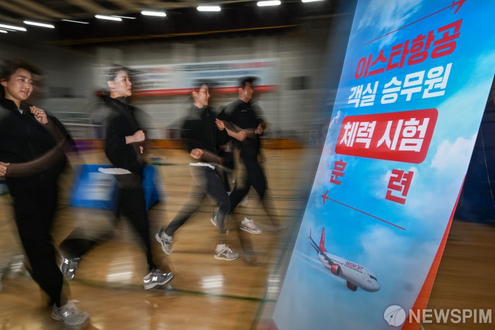 [서울=뉴스핌] 최지환 기자 = 이스타항공 승무원들이 17일 오전 서울 마포구 체력인증센터에서 첫 체력 시험 도입을 앞두고 체력 측정과 훈련을 실시하고 있다. 이스타항공은 오는 23일부터 기내 안전 요원으로서 역량 증진을 위해 신입 승무원들의 체력 시험 전형을 진행할 예정이다. 2025.04.17 choipix16@newspim.com