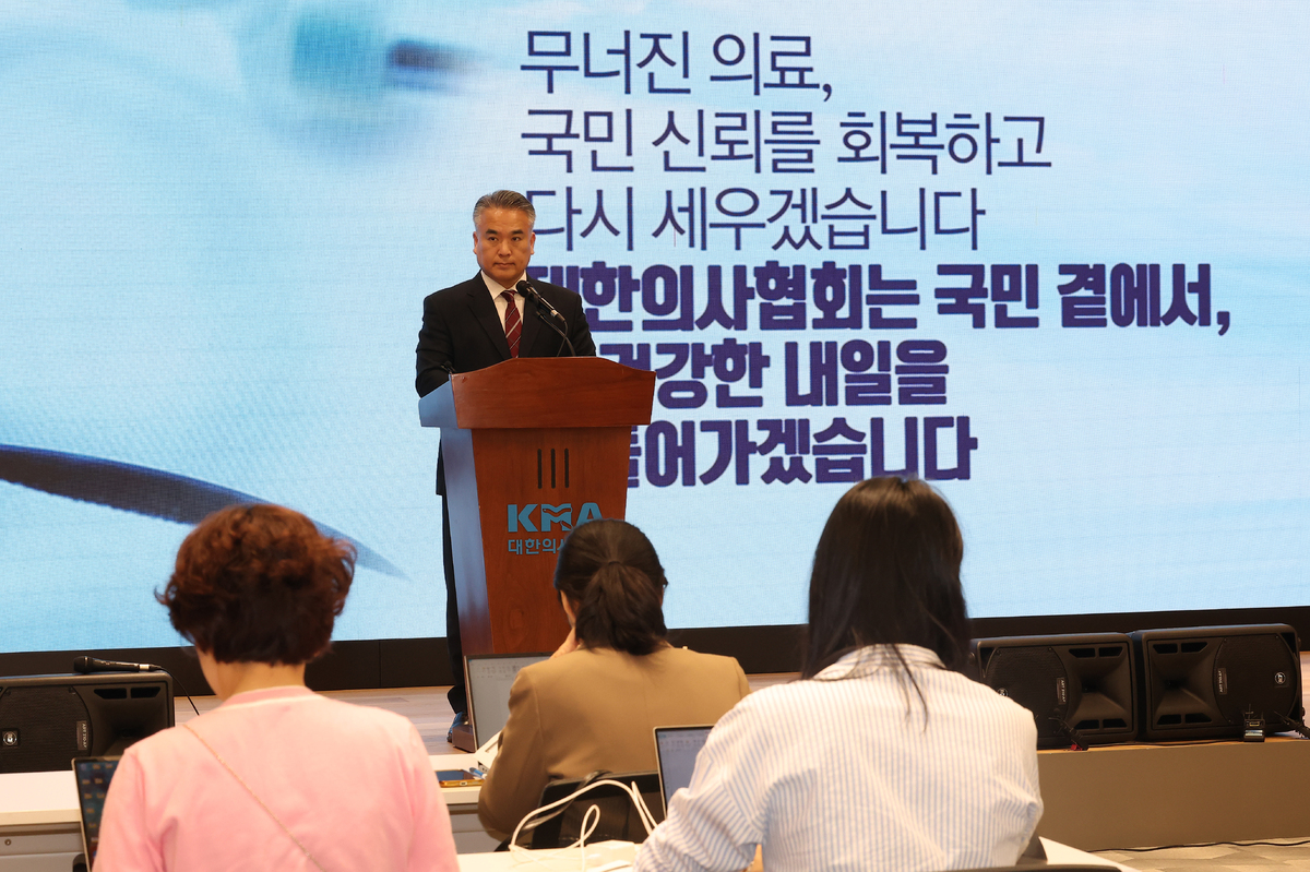 김성근 대한의사협회 대변인이 17일 서울 용산구 의협회관에서 언론 브리핑을 하고 있다. 연합뉴스 |