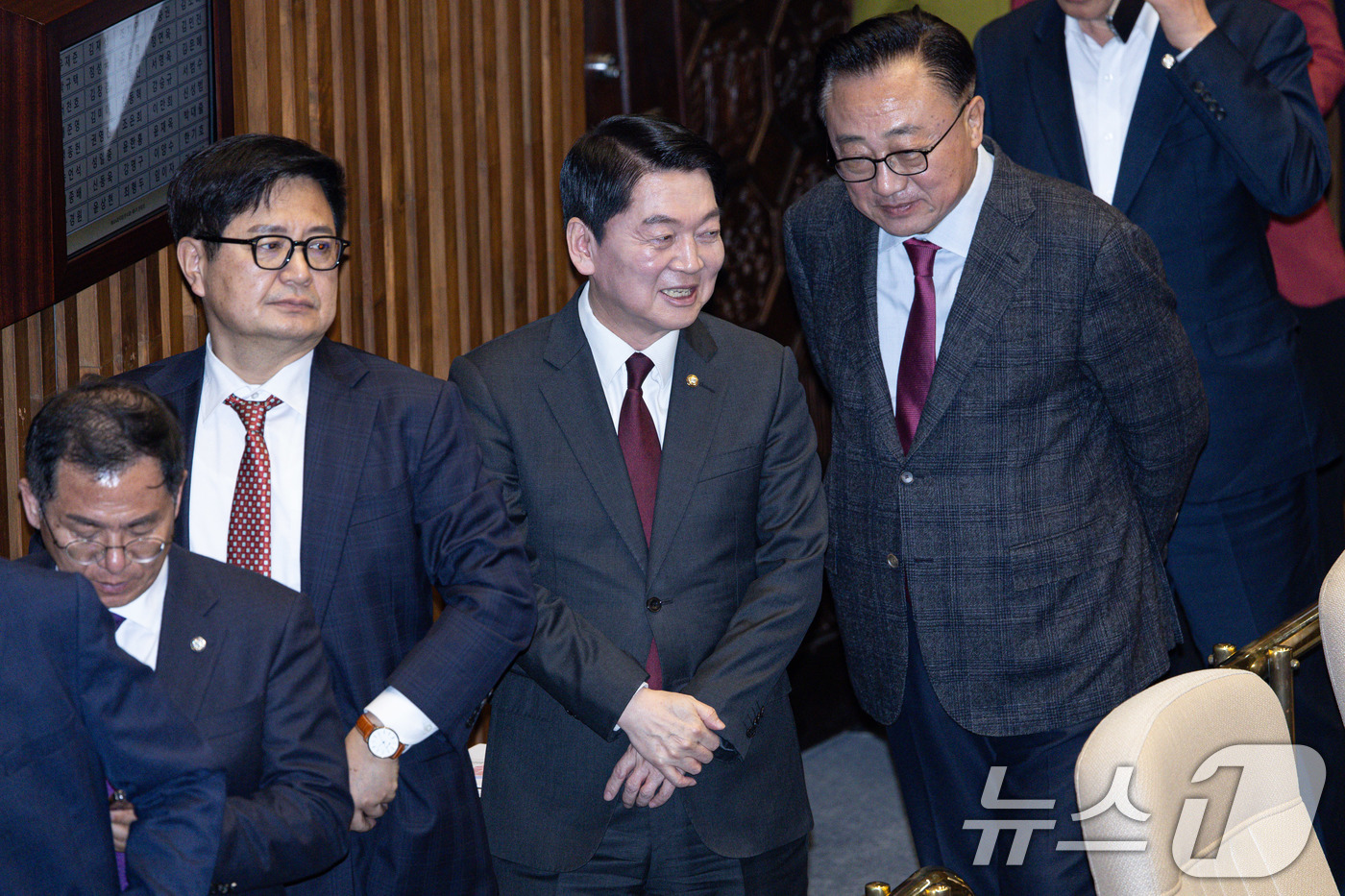 (서울=뉴스1) 이재명 기자 = 제21대 대통령선거에 출마를 선언한 안철수 국민의힘 의원이 권성동 국민의힘 원내대표와 박성재 법무부 장관이 17일 오후 서울 여의도 국회에서 열린 제424회 국회(임시회) 제5차 본회의에서 명태균과 관련한 불법 선거개입 및 국정농단 사건 등의 진상규명을 위한 특별검사의 임명 등에 관한 법률안 재의의 건 등 재의요구 8안건에 대한 무기명 투표를 하기 위해 줄을 서 있다. 2025.4.17/뉴스1