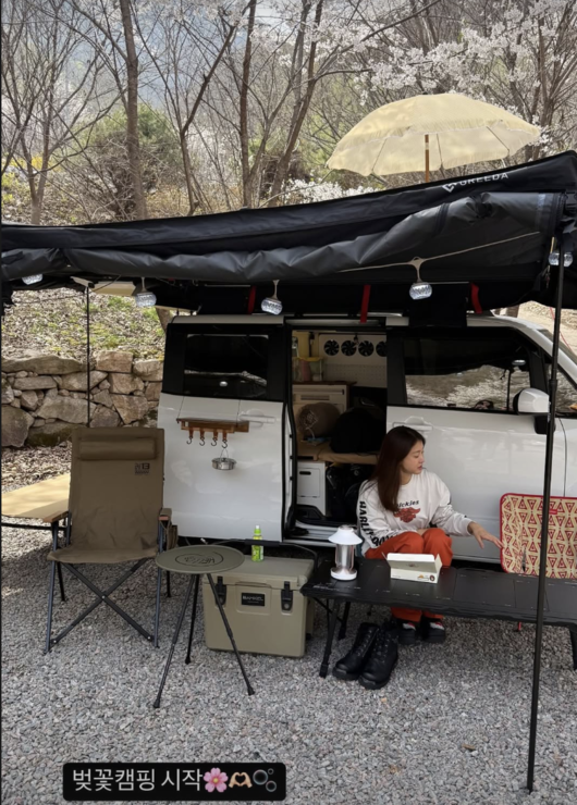 이시영은 16일 자신의 소셜미디어에 "벚꽃캠핑 시작”이라는 글과 함께 사진과 영을 게재했다.