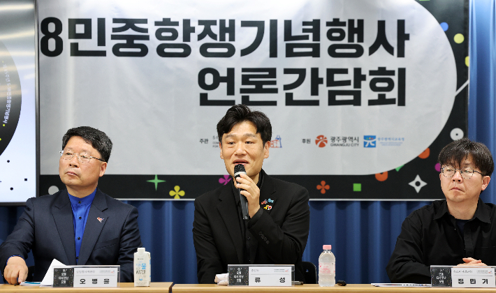 17일 오전 광주 동구 전일빌딩 245에서 열린 제45주년 5·18 민중항쟁기념행사위원회의 언론간담회에서 류성 총감독이 발언하고 있다. 연합뉴스 |
