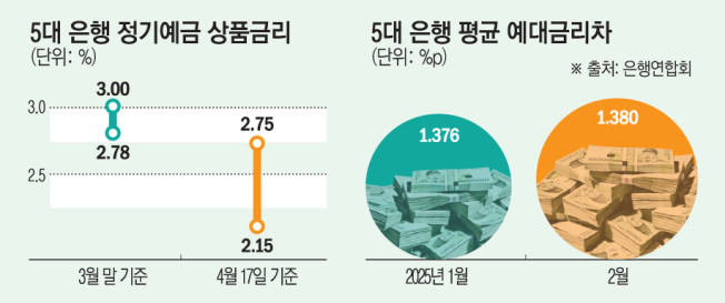 은행들이 예금금리에는 시장금리를 즉각 반영하면서, 대출금리 인하를 주저하는 것은 금융당국의 가계대출 관리 압박 때문이다. 은행들은 금융당국의 주문에 월별·분기별 경영목표에 맞춰 가계대출 총량을 제한 관리 중이다. 지난 2월 서울시의 토지거래허가구역 일시 해제 여파가 이달부터 가계대출 통계에 본격적으로 반영되기 시작하면 금융당국의 기조가 더 세질 것으로 보인다. 은행들은 지금처럼 가산금리를 올리거나 우대금리를 축소하는 방식으로 대응에 나설 가능성이 크다.