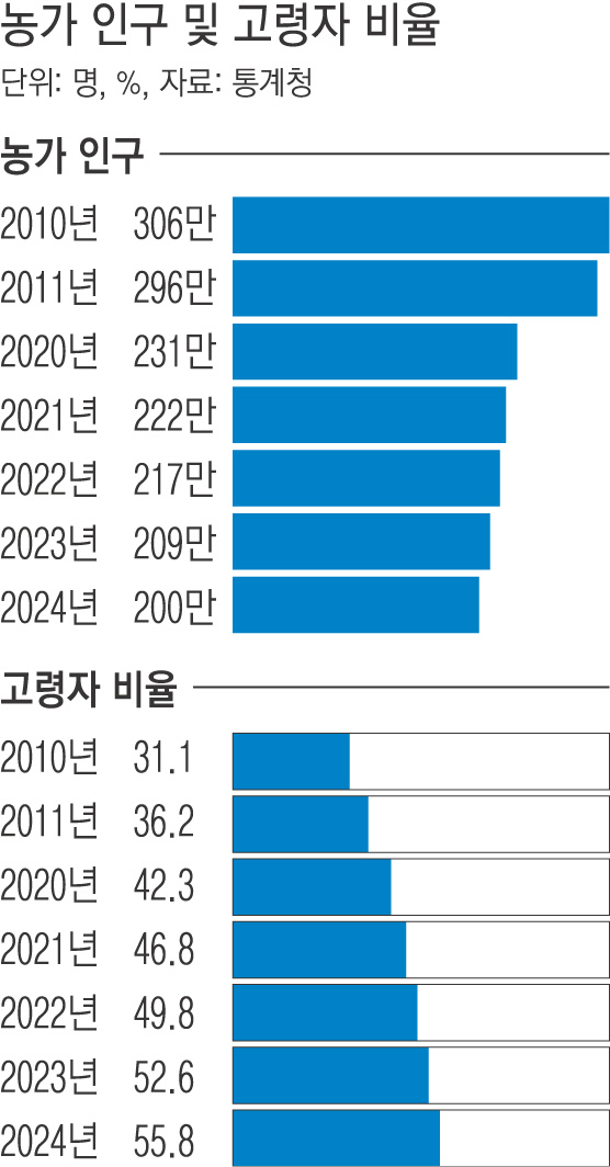 반면 농가의 65세 이상 고령 인구 비율은 지난해 55.8%(111만8000명)로 전년보다 3.2%포인트 증가했다. 이는 우리나라 전체 고령 인구 비율(19.2%)의 2.9배에 달한다. 연간 농가 고령자 비율은 2010년 31.1%에서 2020년 42.3%, 2021년 46.8%, 2022년 49.8%, 2023년 52.6% 등 가파른 상승세를 보이고 있다.
