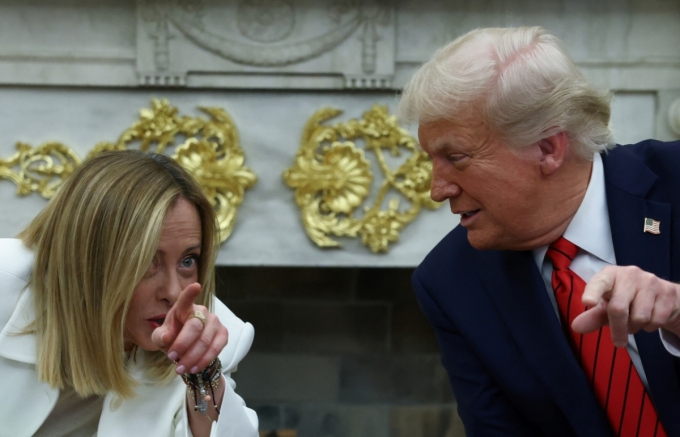 도널드 트럼프 미국 대통령이 17일(현지시간) 워싱턴DC 백악관 집무실에서 조르지아 멜로니 이탈리아 총리와 정상회담을 하고 있다. /로이터=뉴스1 |
