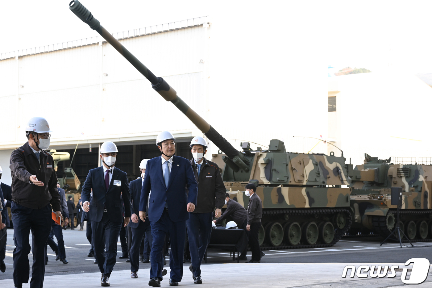 윤석열 전 대통령이 경남 창원시 한화에어로스페이스를 방문해 전시 장비를 둘러보는 모습.(대통령실 제공) 2022.11.24/뉴스1 ⓒ News1 오대일 기자 |