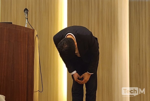 김석환 위믹스 PTE 대표가 위믹스 자산 탈취 관련 기자회견에 참석해 고개를 숙이고 사과하고 있다. / 사진=조성준 기자 |