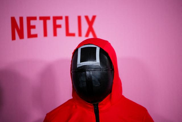 넷플릭스 드라마 오징어 게임 속 핑크솔져로 분한 사람이 넷플릭스 로고가 새겨진 벽 앞에 서 있다. 로이터 연합뉴스 |