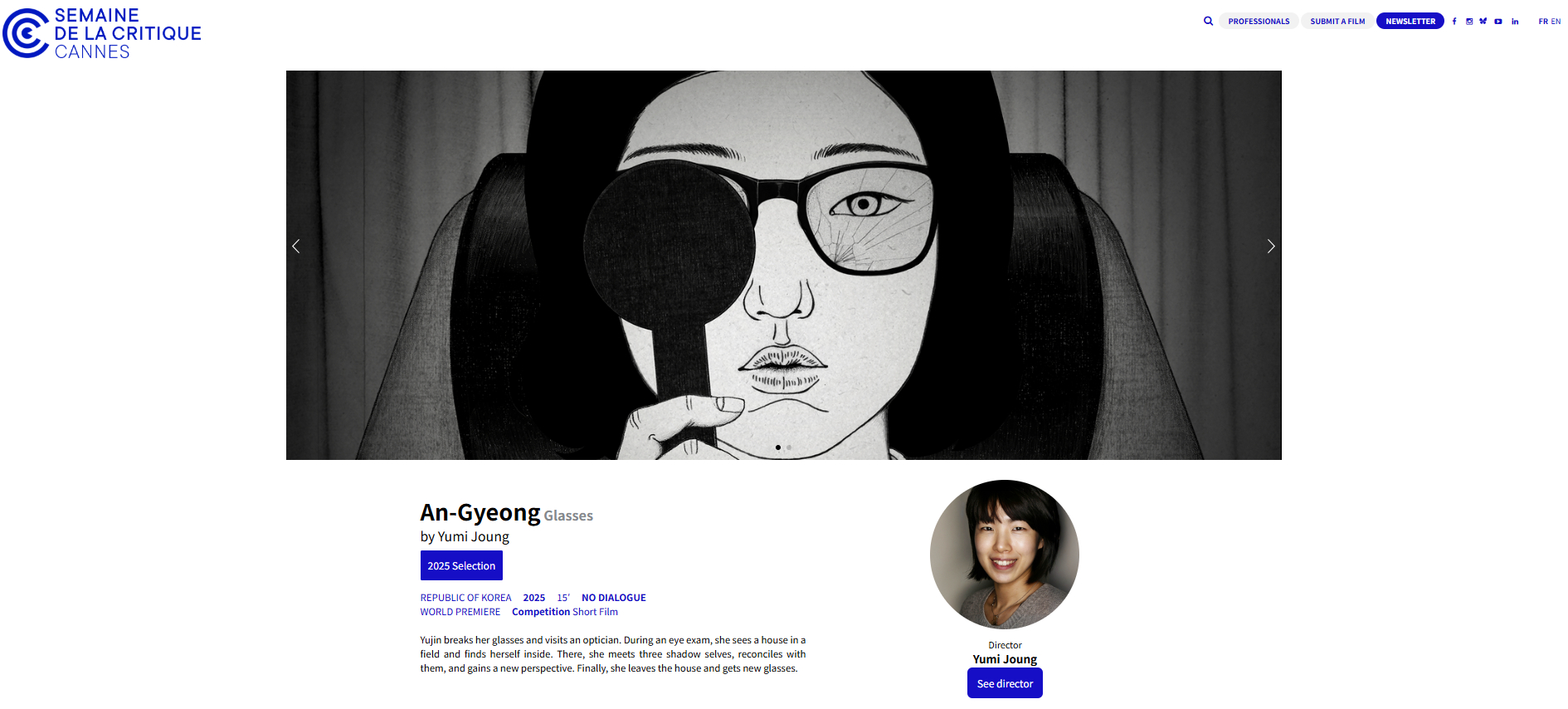 비평가주간 측은 현지 시간 17일 공식 홈페이지를 통해 정 감독의 '안경'을 제78회 칸국제영화제 비평가주간 단편 경쟁 부문에 초청한다고 밝혔습니다.