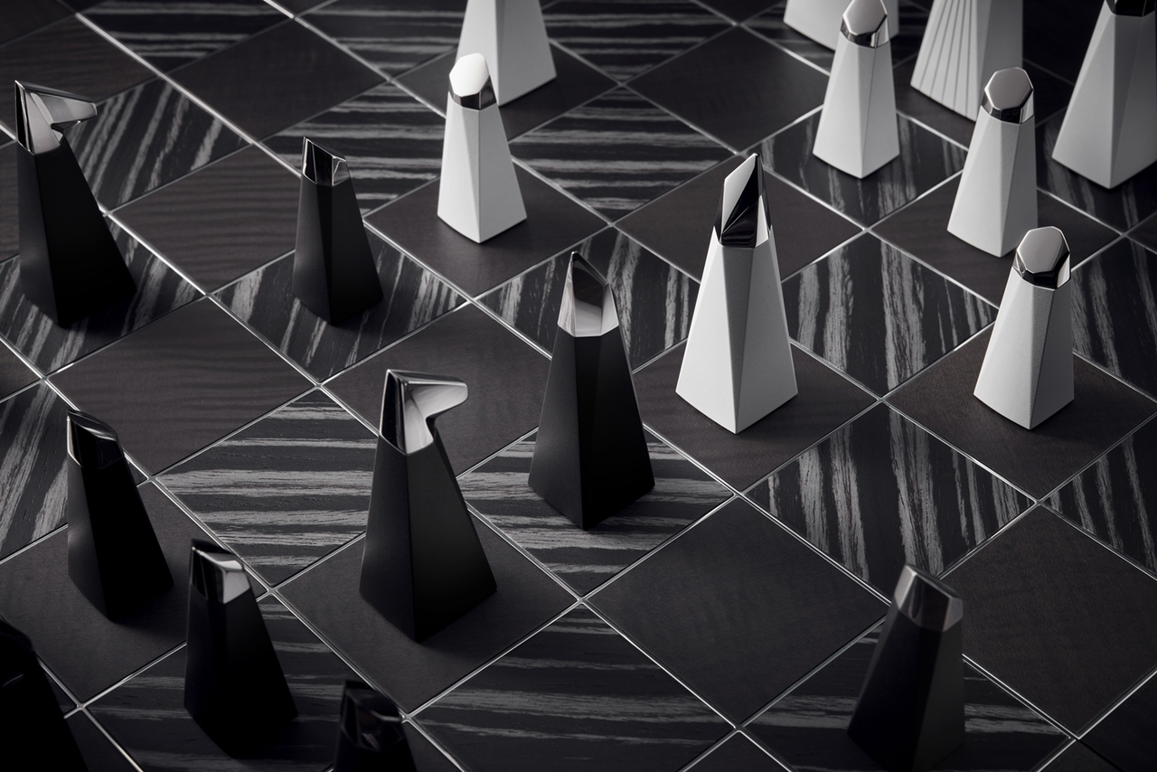 체스판 표면 마감은 고광택 마감과 천연 질감을 살린 오픈 포어 방식 두 가지로 구성되며, 전자는 ‘블랙우드 & 세라믹 화이트’, ‘마카사르 에보니 & 로열 월넛’ 조합 2종으로, 후자는 ‘스모크드 유칼립투스 & 팔다오’, ‘옵시디언 아요우스 & 블랙우드’ 조합 2종으로 구성된다.