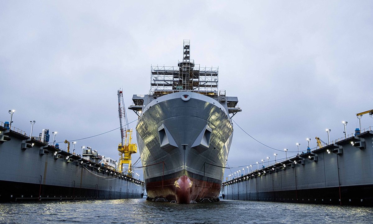 미국의 헌팅턴 잉걸스 조선소의 부유식 시설에 미 해군 강습상륙함 트리폴리함이 놓여 있다. 세계일보 자료사진 |