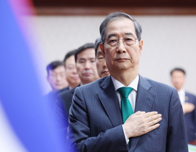 한덕수 대통령 권한대행 국무총리가 18일 정부서울청사에서 추가경정예산안 심의 임시국무회의에서 국기에 경례하고 있다./사진제공=뉴시스 |