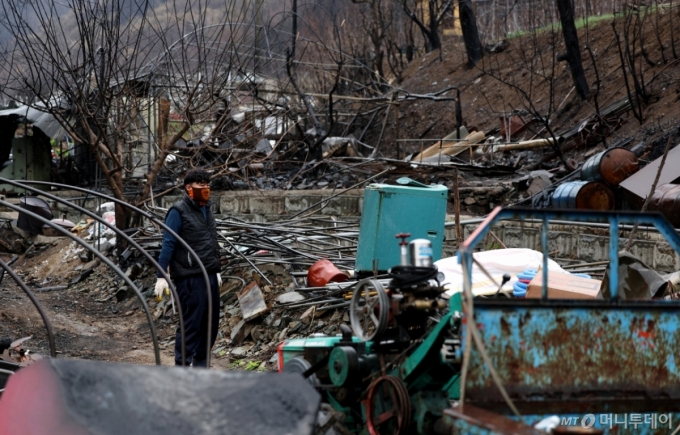 14일 경북 안동시 임하면 추목리 한 농가에서 산불 피해를 입은 한 주민이 불에 탄 농기계를 살펴보고 있다. 2025.04.14. /사진=뉴시스 |
