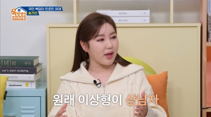 가수 송가인(39)이 이상형으로 꼽은 김종국(49)과 공감대를 형성했다. /사진=KBS2 '옥탑방의 문제아들' 방송 화면 |