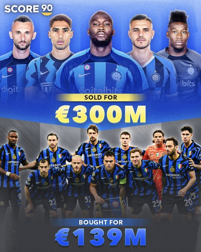 축구 컨텐츠 매체 'Score90'은 17일(이하 한국시간) "인터 밀란은 다섯 명의 선수를 팔았는데, 이 금액은 바이에른 뮌헨전 선발 출전한 선수들 영입에 쓴 금액에 2배가 넘는다"라고 전했다.