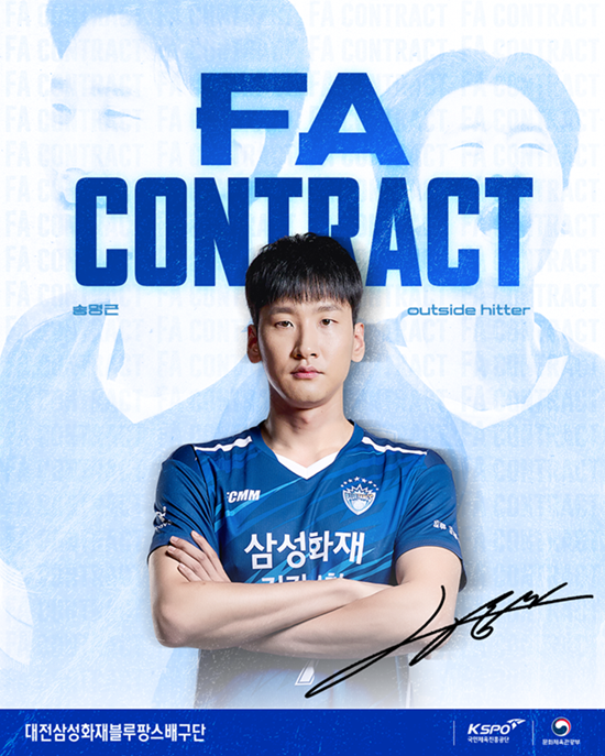 삼성화재는 18일 "자유계약(FA) 선수 송명근(32)과 계약을 체결했다. 계약 기간은 2년이며, 최대 총액 9억원(연봉 4억2000만원·옵션 3000만원)에 합의했다"고 밝혔다.