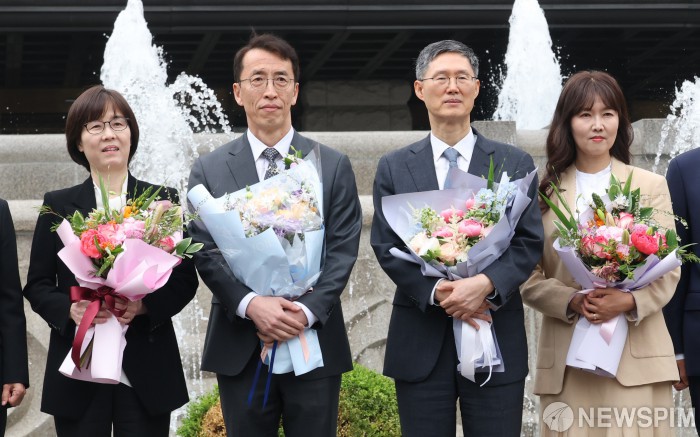 [서울=뉴스핌] 이호형 기자 = 문형배 헌법재판소장 권한대행 내외와 이미선 헌법재판관내외가 18일 오전 서울 종로구 헌법재판소에서 열린 퇴임식 후 헌재 정문 앞에서 기념촬영을 하고 있다. 2025.04.18 leemario@newspim.com |
