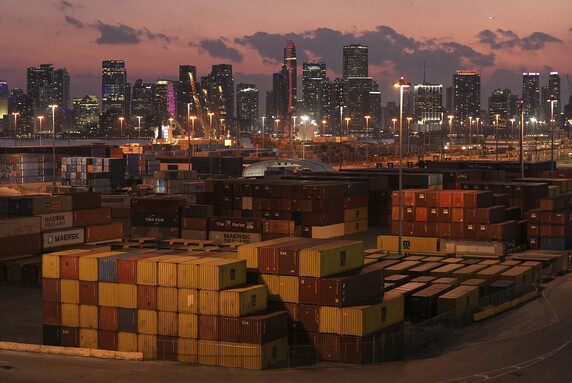 16일 해질녘 미국 플로리다주 마이애미항에 선적 컨테이너가 쌓여 있다. 뒤편으로 마이애미 도심 스카이라인이 보인다. AP연합뉴스 |