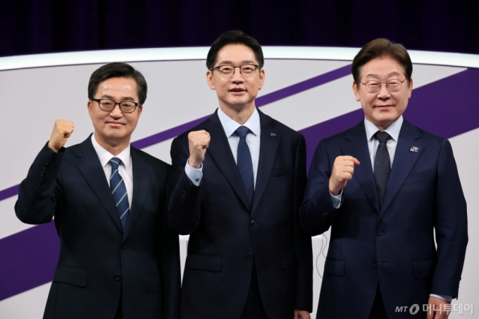 [서울=뉴시스] 국회사진기자단 = 더불어민주당 제21대 대통령 선거 경선 후보인 이재명(오른쪽부터), 김경수, 김동연 후보가 18일 서울 마포구 상암동 MBC에서 첫 TV토론회 준비를 하고 있다. 2025.04.18. photo@newsis.com /사진= |