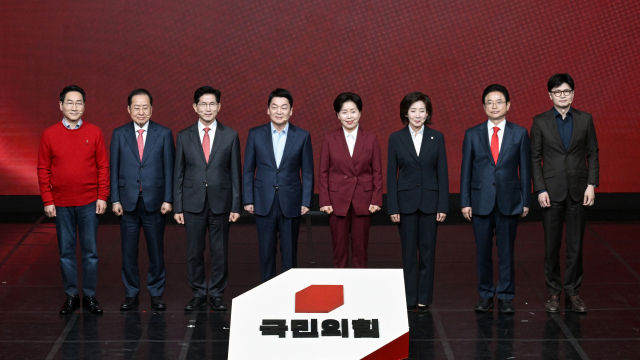 ▲18일 서울 강서구 ASSA아트홀에서 열린 '제21대 대통령후보자 국민의힘 1차 경선 후보자 비전대회' 에 참석한 후보들이 기념촬영 하고 있다. 왼쪽부터 유정복, 홍준표, 김문수, 안철수, 양향자, 나경원, 이철우, 한동훈 후보. ⓒ연합뉴스 |