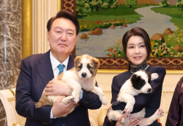 윤석열 전 대통령 부부가 투르크메니스탄 국견 알라바이 두 마리를 안고 있다. 대통령실 제공 |
