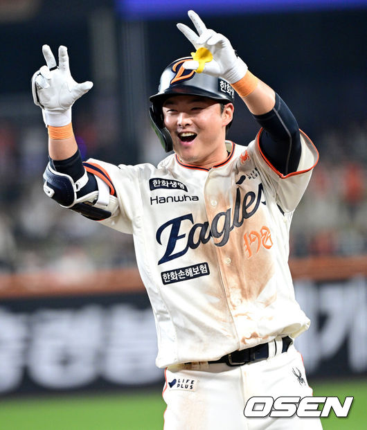 [OSEN=대전, 최규한 기자] 18일 오후 대전 한화생명 볼파크에서 ‘2025 신한 SOL Bank KBO리그’ 한화 이글스와 NC 다이노스의 경기가 열렸다.홈팀 한화는 엄상백, 방문팀 NC는 로건 앨런을 선발로 내세웠다.6회말 2사 만루 상황 한화 이도윤이 달아나는 2타점 적시타를 날리고 1루에 안착해 기뻐하고 있다. 2025.04.18 / dreamer@osen.co.kr |